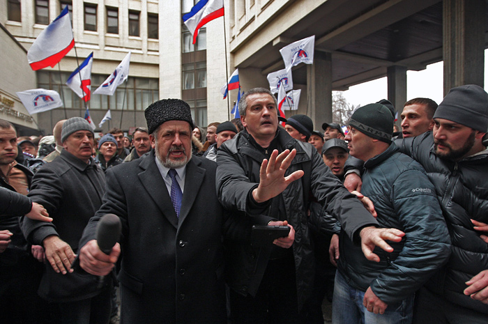 Рефат Чубаров и Сергей Аксенов (слева направо на первом плане) у здания Верховного совета Крыма в Симферополе, 26 февраля 2014 года. Фото: Тарас Литвиненко / РИА Новости