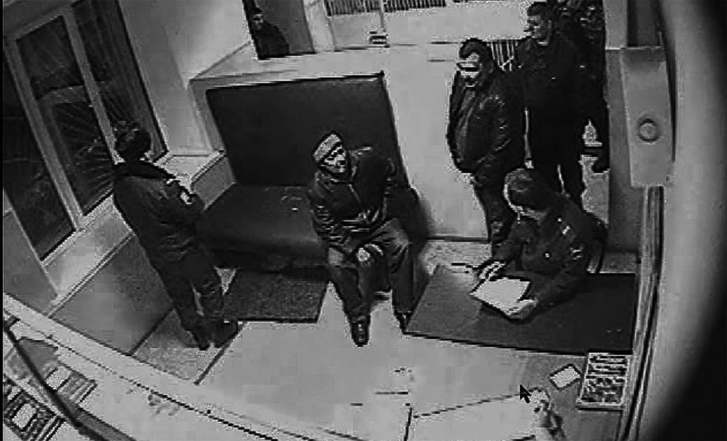 22:33:00. В сопровождении троих полицейских он заходит в вытрезвитель и становится у окна, расположенного справа от входа, рядом с диваном. Держит руки в кармане куртки, не оказывая сопротивления и не проявляя агрессии. Милиционер Денис Овчинников садится на диван и заполняет бумаги. Он настаивает на проведении личного досмотра. Задержанный, вытащив из кармана какой-то мусор, возмущается просьбой отдать свое имущество и делает резкое движение правой рукой в его сторону. Овчинников вскакивает и встает напротив Самойлова. К нему подходят еще трое коллег — Андрей Сидоров, Александр Кувшинов и Дмитрий Косолапов.