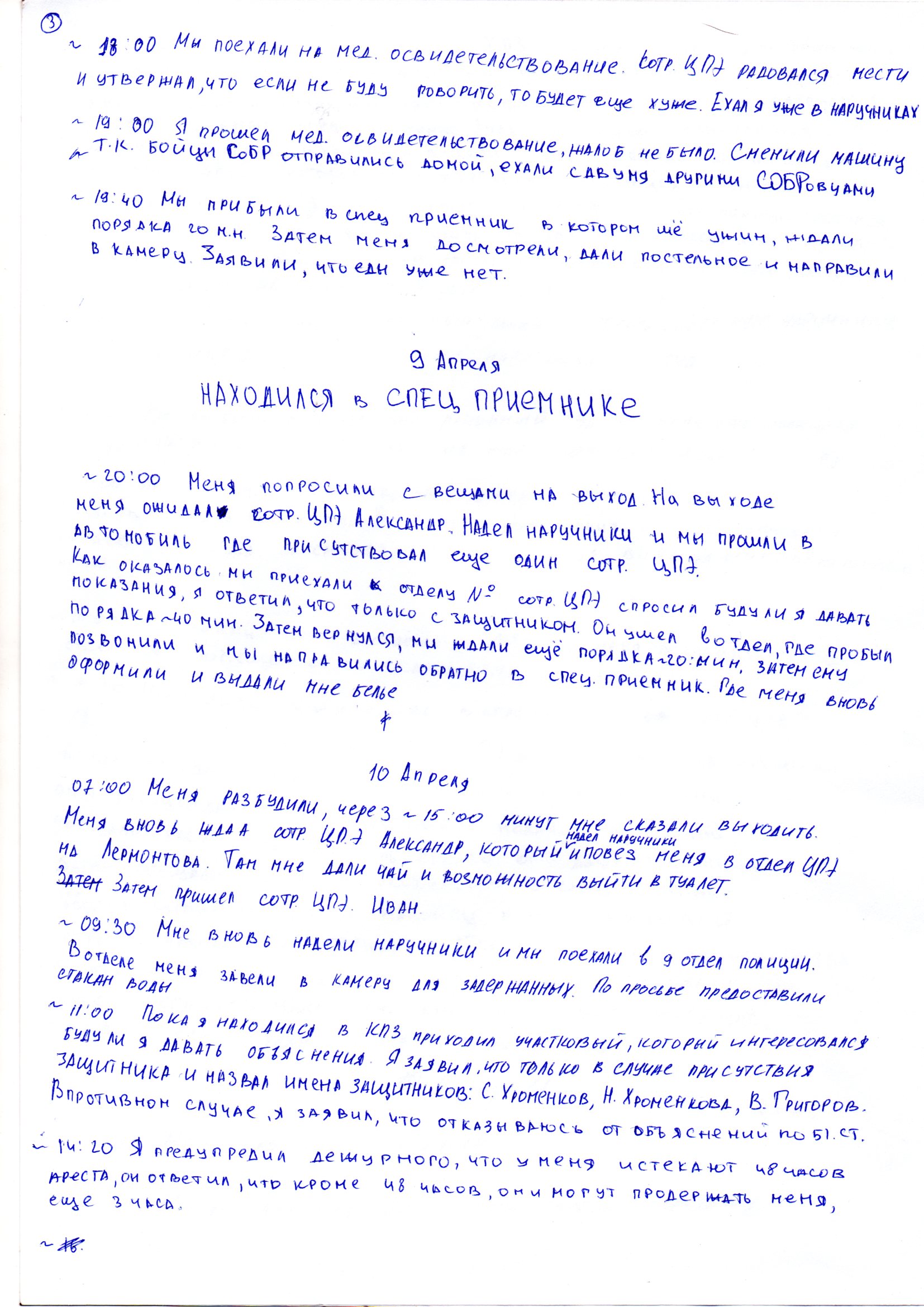 10:00 Приходит новый сотрудник ЦПЭ Александр, пытается разговорить, пугает спецприемником, и так далее. Я все еще отказываюсь по 51-й статье и требую защитников, одного из трех: Хроменкова С., Хроменкову Н. или Григорова В. Александр отвечает, что дело уголовное, и мне не будут звать защитников. На вопрос, в каком статусе я нахожусь, мне не отвечают. Продолжаю стоять у стены.