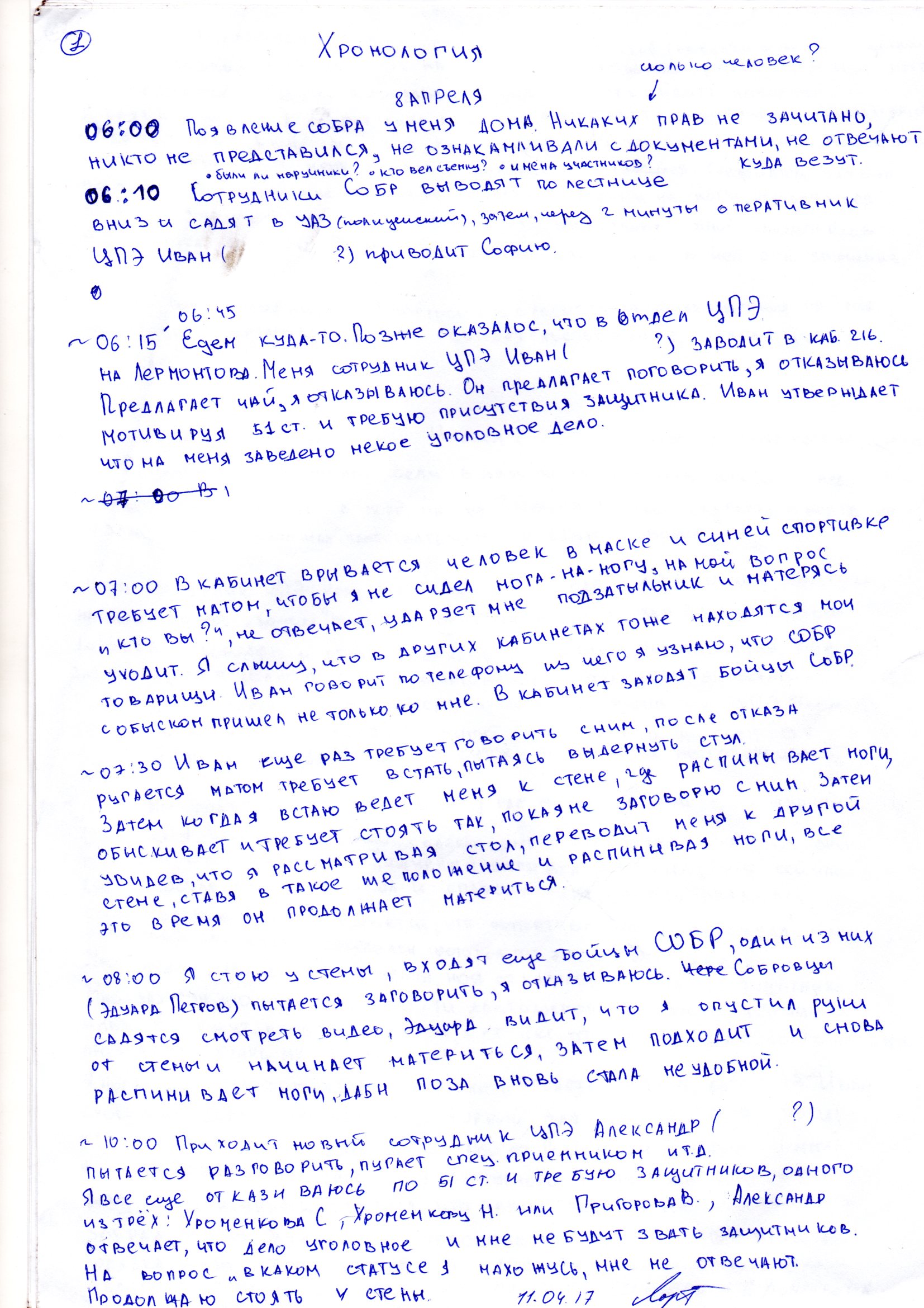 7:00 В кабинет врывается человек в маске и синей спортивке, требует матом, чтобы я не сидел нога-на-ногу, на мой вопрос «Кто вы?» не отвечает, ударяет мне подзатыльник и, матерясь, уходит. Я слышу, что в других кабинетах тоже находятся мои товарищи. Иван говорит по телефону, из чего я узнаю, что СОБР с обыском пришел не только ко мне. В кабинет заходят бойцы СОБР.