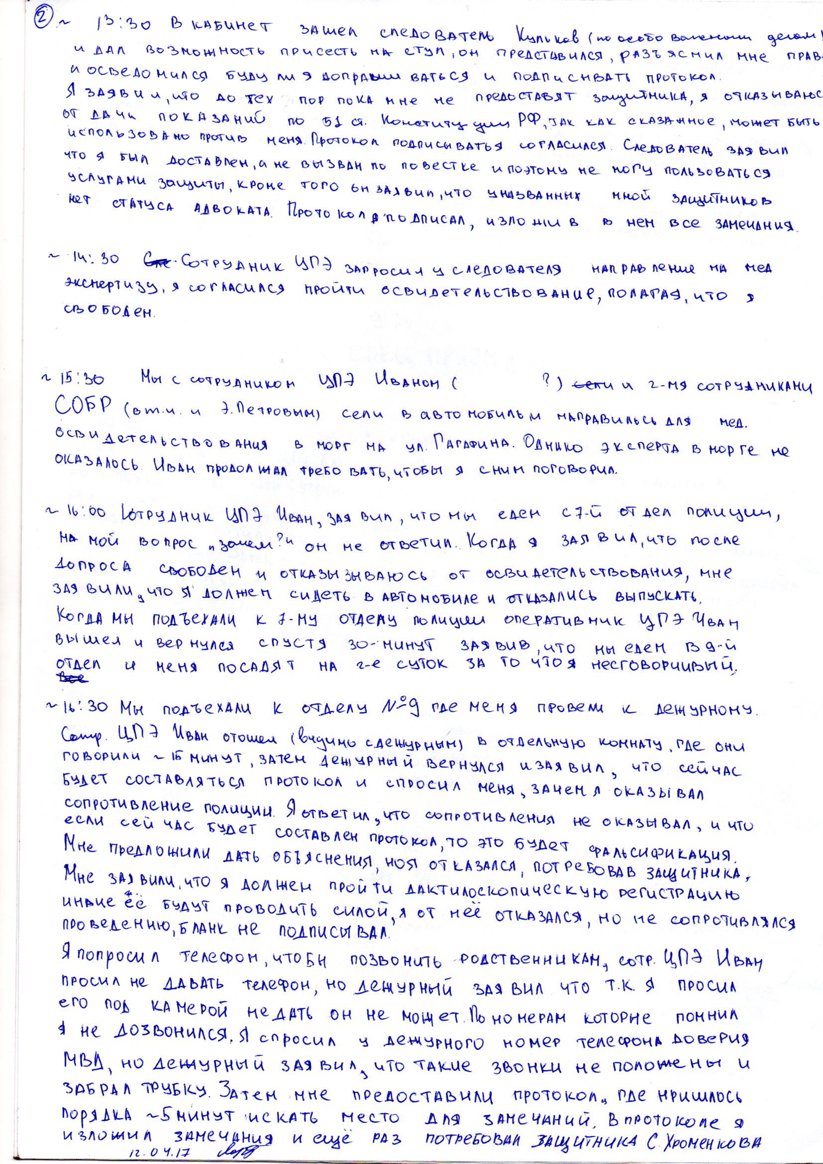 13:30 В кабинет зашел следователь Кульков (по особо важным делам) и дал возможность присесть на стул. Он представился, разъяснил мне права и осведомился, буду ли я допрашиваться и подписывать протокол. Я заявил, что до тех пор, пока мне не предоставят защитника, я отказываюсь от дачи показаний по 51-й статье Конституции РФ, так как сказанное может быть использовано против меня. <...> Протокол я подписал, изложив в нем замечания.