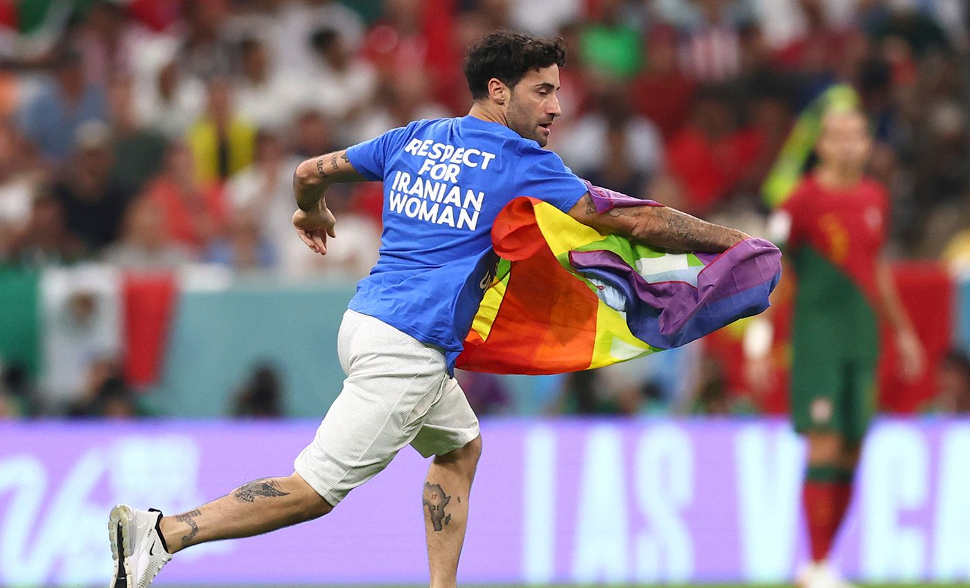28 ноября во время игры сборных Уругвая и Португалии на поле выбежал болельщик с радужным флагом, на его футболке спереди было написано Save Ukraine, сзади — Respect For Iranian Woman. Судьей на этом матче был иранец Алирез Фагани, он вынес флаг за пределы поля.