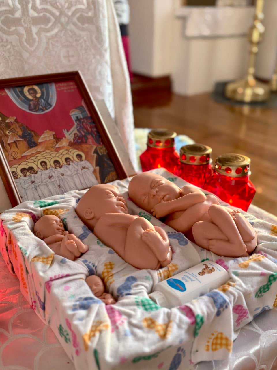 Те же флаги и куклы заметны на фотографиях с молебна в храме Сретения Господня города Рыбинска Ярославской области. Движение «За жизнь» использует для наглядной агитации американские модели эмбрионов Touch of Life (розничная цена в США колеблется в пределах $250-300).
