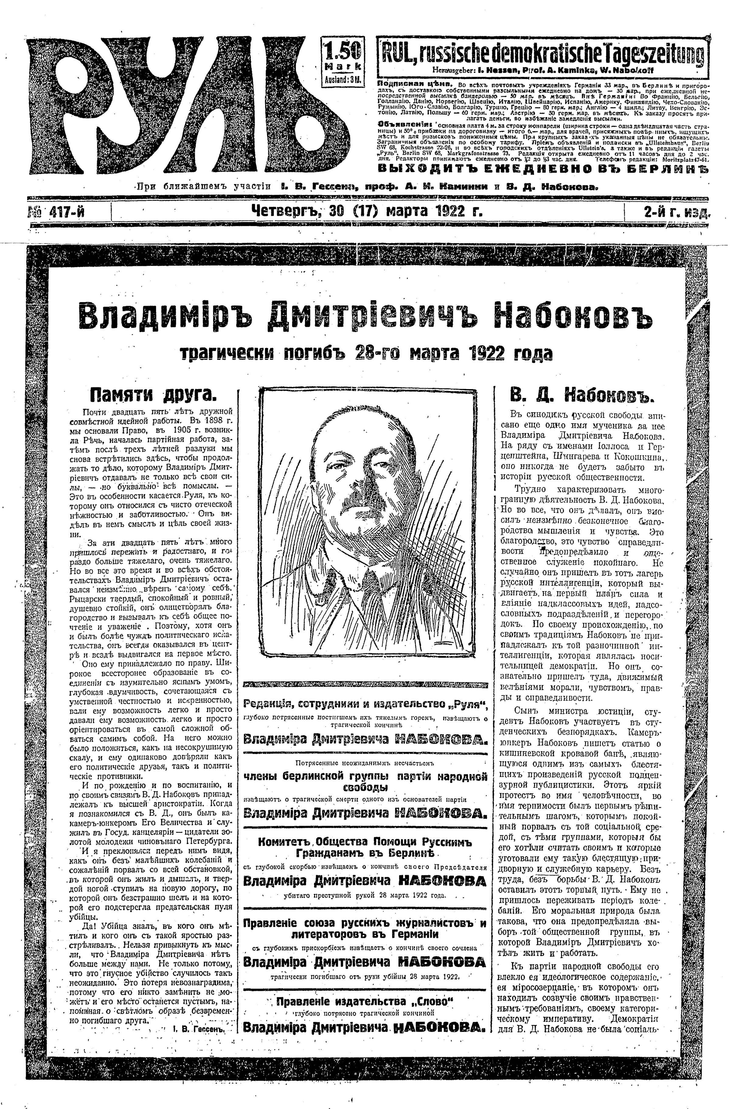 Оказавшись в 1919 г. в Лондоне, англофил Набоков обнаружил, что реальной работы там для него нет — британские политики помочь кадетам не могли, а, кроме того, Лондон слишком далек и от России, и от складывавшихся в континентальной Европе центров эмиграции. Летом 1920 года он принял решение перебраться в Берлин, чтобы основать вместе с друзьями и коллегами — Иосифом Гессеном и Августом Каминкой — «настоящую русскую газету», похожую на бывшую кадетскую «Речь». В августе Набоковы — сам Владимир Дмитриевич, его мать Мария Фердинандовна, супруга Елена Ивановна и младшие дети — Елена, Ольга и Кирилл — поселились в Берлине, и уже осенью Набоков, Гессен и Каминка выпустили первый номер газеты «Руль».