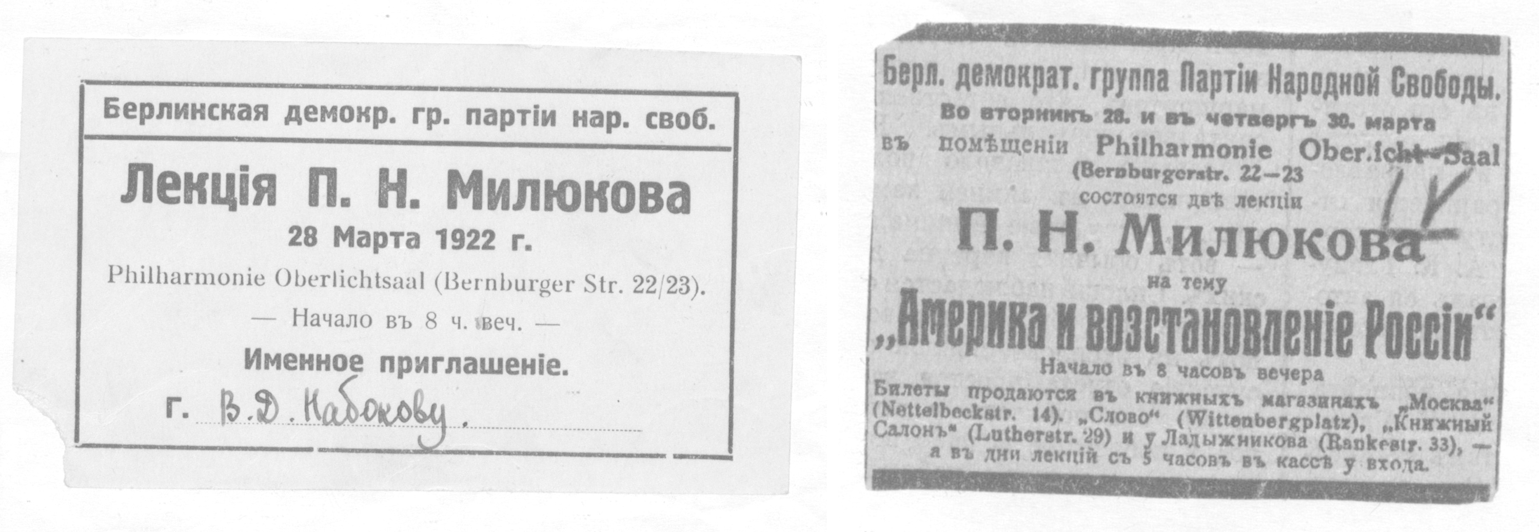 Слева: Именное приглашение на лекцию Милюкова, выданное В.Д. Набокову. Landesarchiv Berlin. Справа: Газетная вырезка о предстоящей лекции Милюкова, обнаруженная у одного из террористов