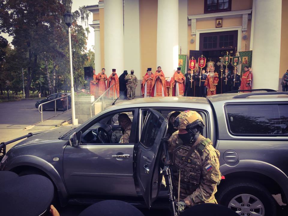 Издание также опубликовало фотографии праздника у крыльца собора Александра Невского. На них из автомобиля выходят люди в камуфляже в масках и с автоматом. На еще одной фотографии служебная собака бежит на нападающего, у которого при себе есть оружие. Кроме того, в мероприятии участвовали казаки, которые показывали выступления с шашками.
