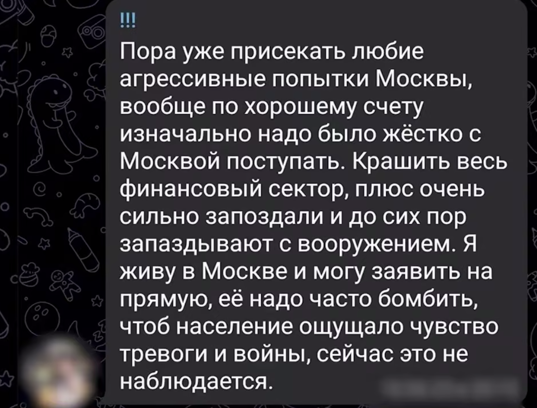 В видео опубликован скриншот одного из комментариев, ставших поводом для дела. В сообщении говорилось о необходимости «жестко с Москвой поступать» и «часто бомбить» столицу, чтобы «население ощущало чувство тревоги и войны». На вопрос следователя, писал ли задержанный этот комментарий, житель Подольска ответил: «Да, возможно писал».