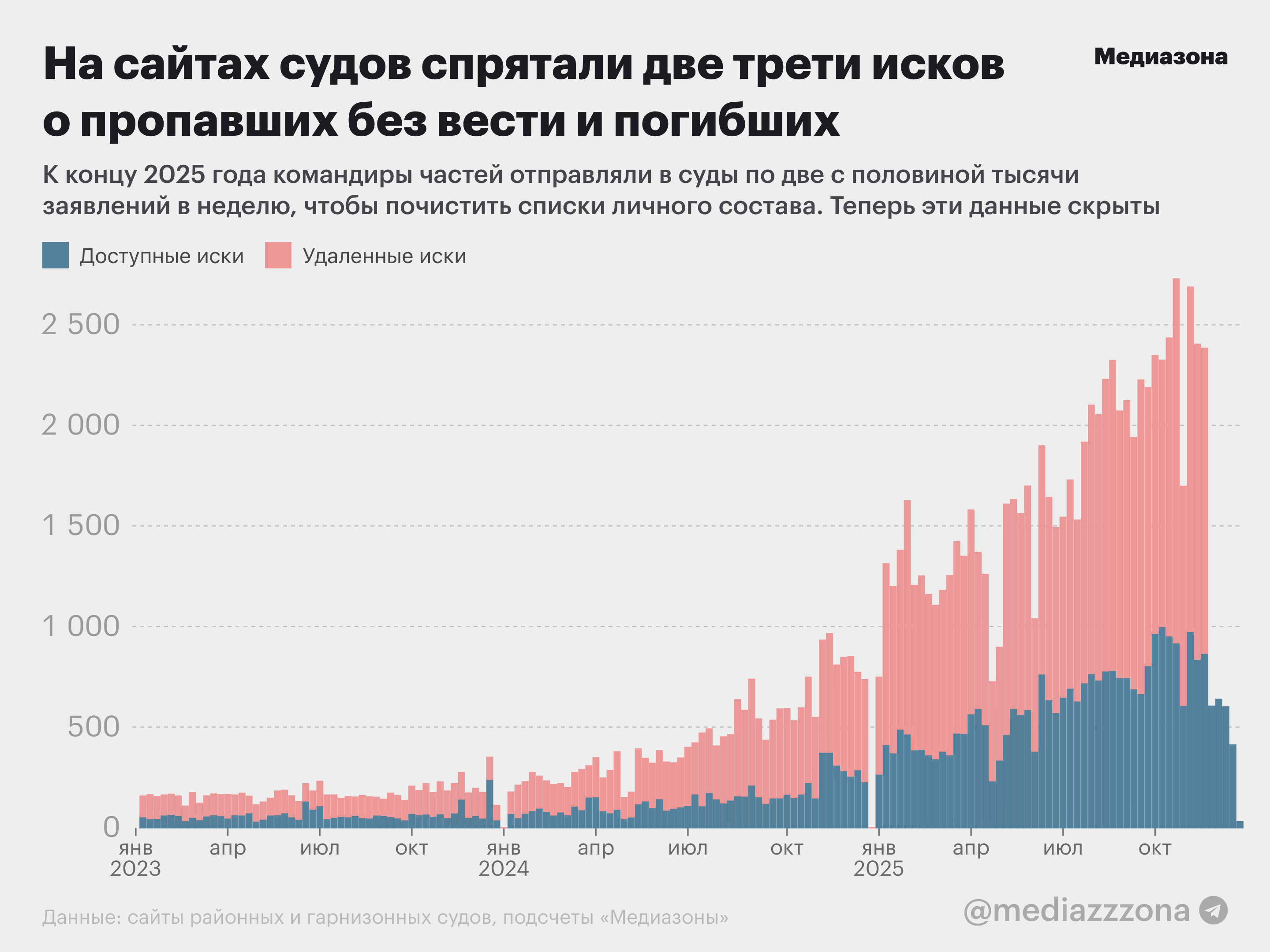 Сейчас на сайтах судов 50 российских регионов невозможно найти ни одного зарегистрированного в 2025 году иска о признании человека пропавшим. При этом еще месяц назад на сайтах судов этих регионов «Медиазона» видела информацию о почти 44 тысячах таких дел за 2025-й.