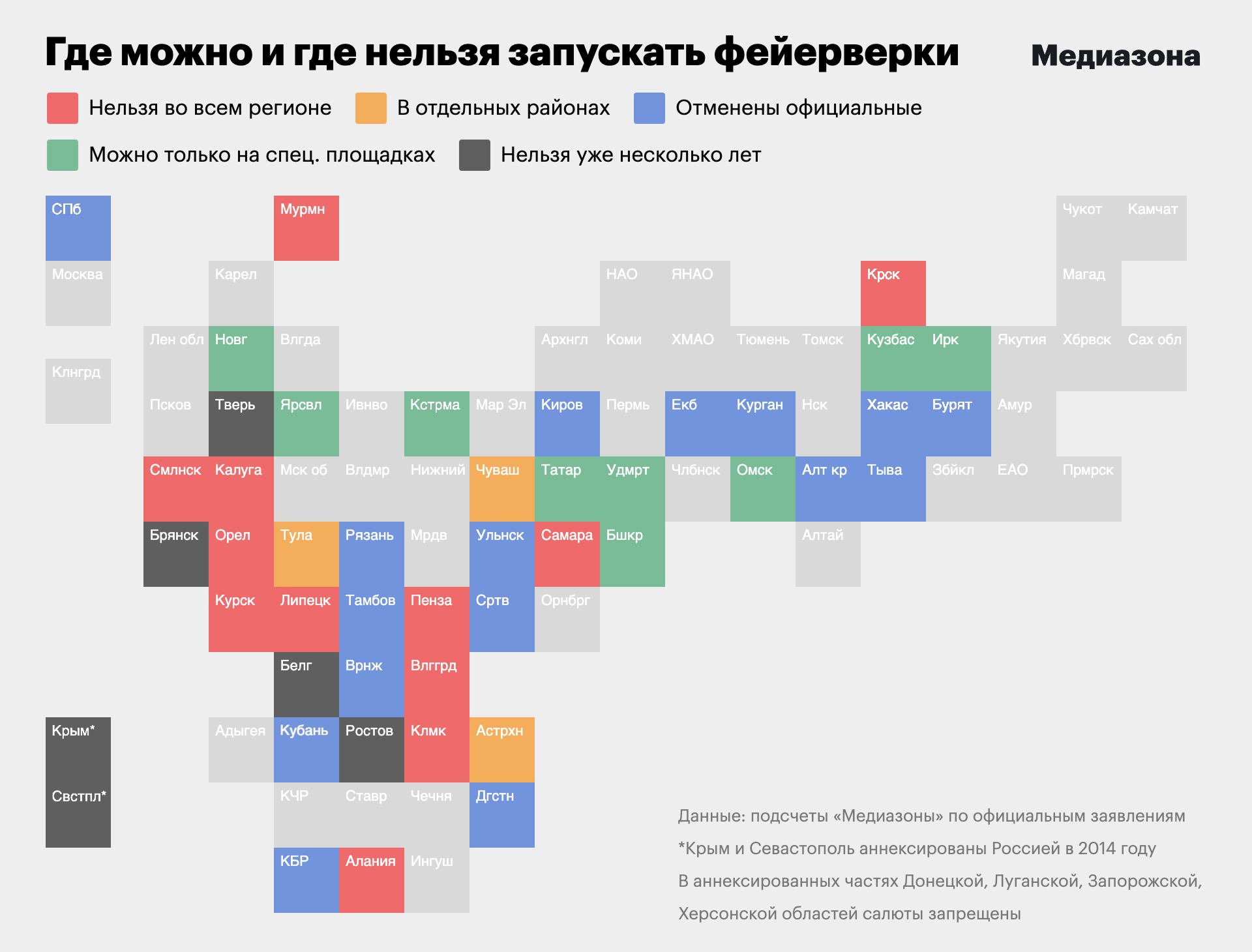 Десятки российских регионов в преддверии новогодних праздников объявили о полном запрете либо ограничениях на использование фейерверков. Меры заметно различаются по жесткости: если в одних субъектах запуск пиротехники запрещен полностью и грозят штрафы, то в других речь идет лишь о рекомендациях и отмене официальных мероприятиях — в том числе нередко под предлогом «солидарности» с российскими солдатами, которые воюют в Украине. Региональные ограничения проанализировала «Медиазона».