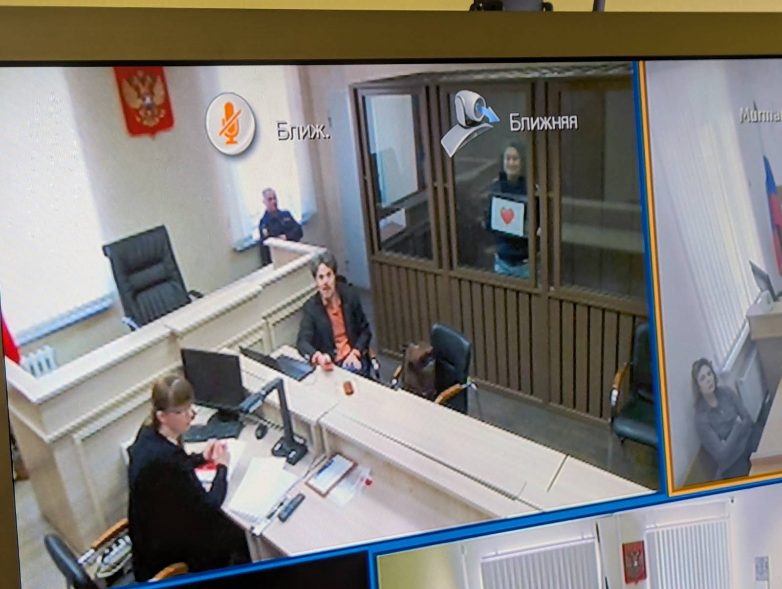 Подсудимая принимала участие в заседании по ВКС из Сыктывкарского горсуда. После перерыва она достала листок с красным сердечком и показала его в камеру пришедшим на заседание слушателям и журналистам.
