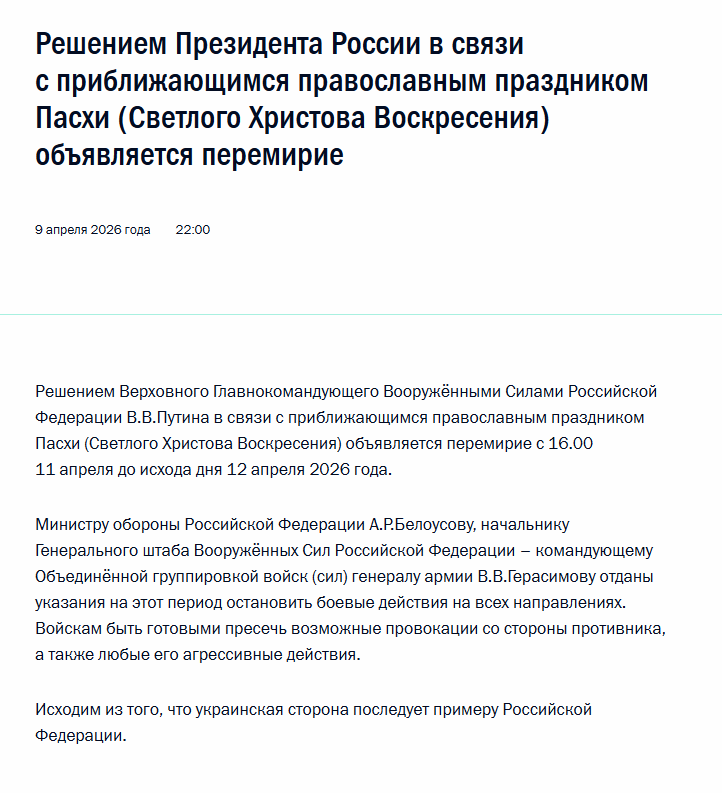 Пасхальное перемирие начнется 11 апреля в 16:00 и продлится «до исхода дня 12 апреля». «Исходим из того, что украинская сторона последует примеру Российской Федерации», — добавили в Кремле.