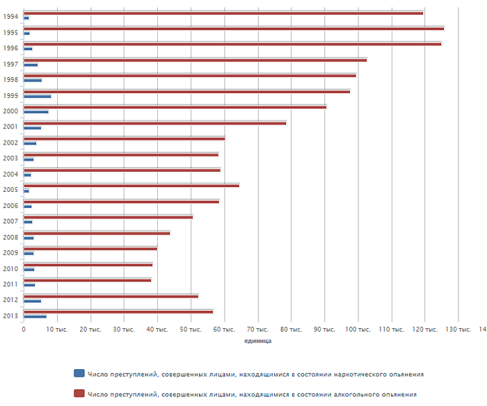 По данным же МВД, опубликованным Федеральной службой государственной статистики, количество преступлений, совершенных в состоянии алкогольного опьянения, в разы превосходит преступления в состоянии опьянения наркотического.