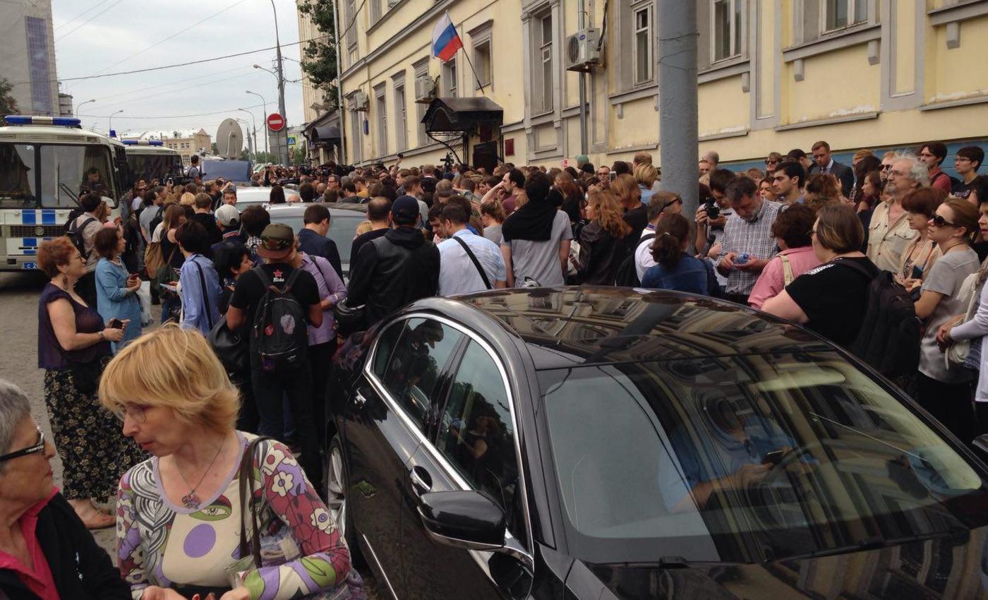 Заседание назначено на полдень. У здания Басманного районного суда Москвы собрались сотрудники и актеры «Гоголь-центра».