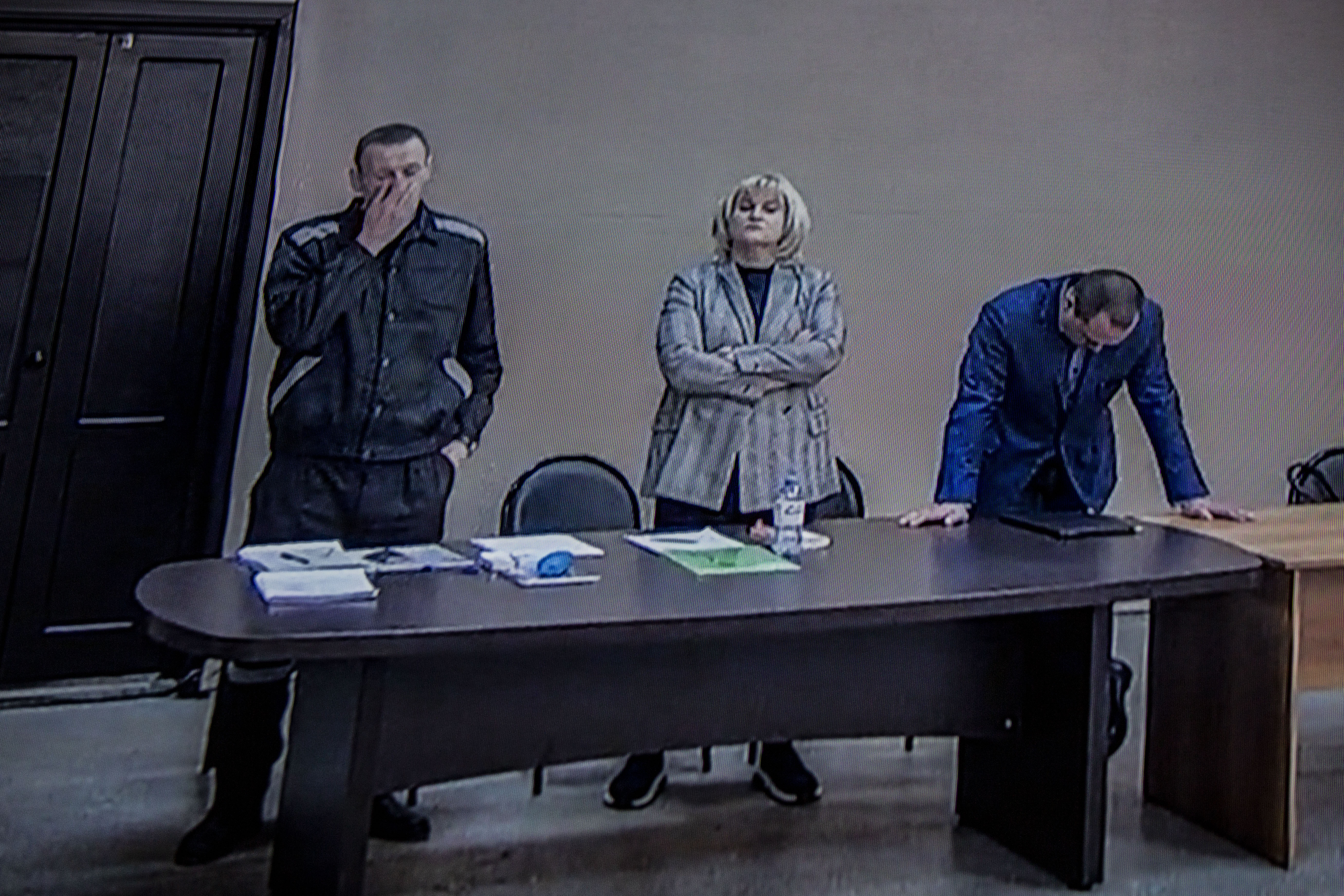 Адвокаты Ольга Михайлова и Вадим Кобзев слушают приговор в одинаковых позах: скрестив руки на груди, оба мрачные. Навальный продолжает перебирать бумаги.