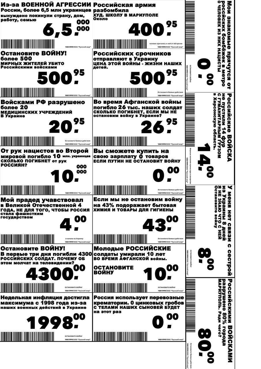 Жарков подробно отвечает, что исследовал — в отличие от экспертов обвинения — не только тексты на ценниках, но и сами ценники. В том числе исследовал плашки на каждом ценнике со словами: «Остановите боевые дейтсвия».