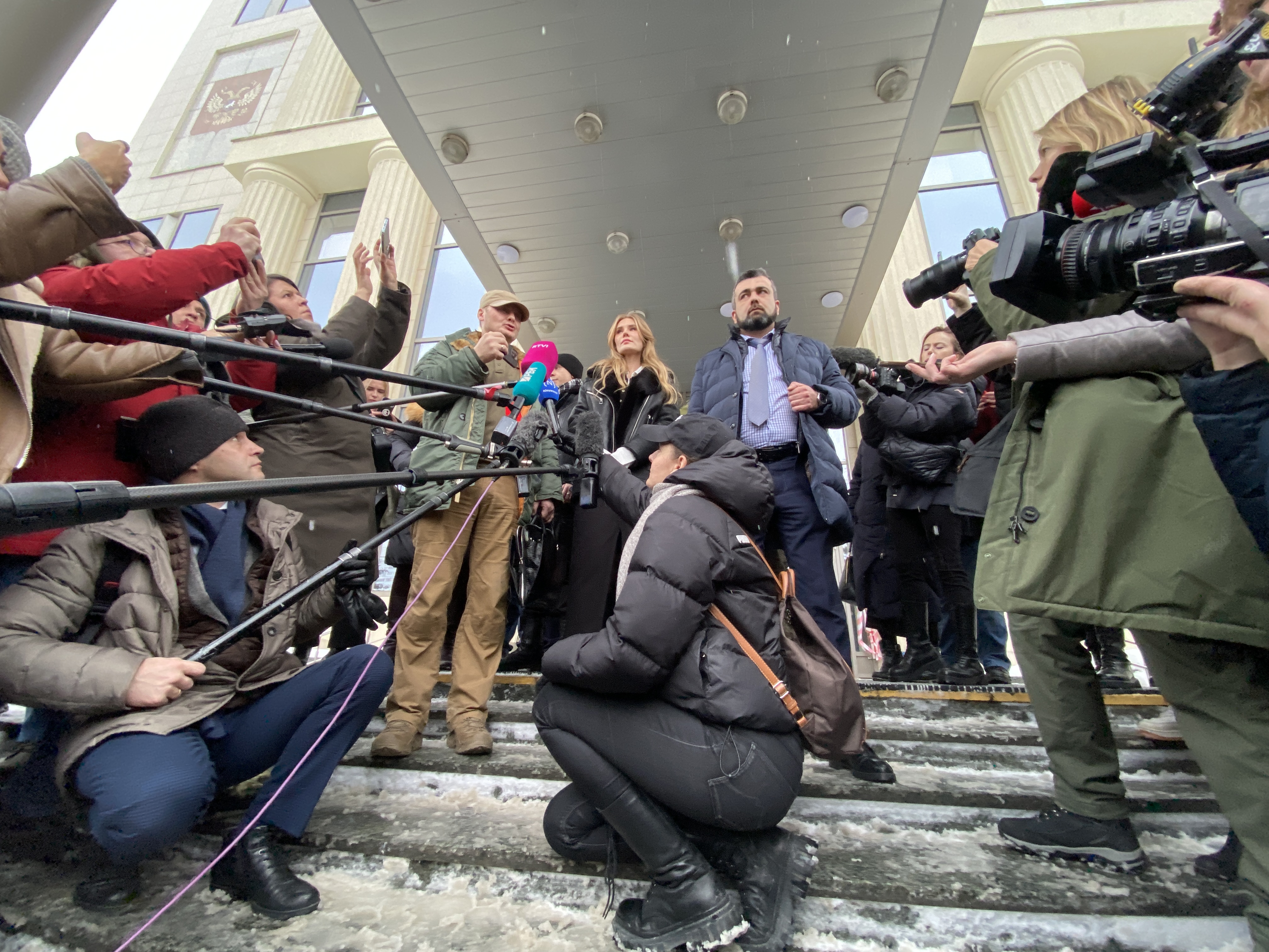 Скоро на крыльцо суда должна выйти жена Стрелкова. Ее выходят ждать те, кто все же смог пройти поддержать подсудимого в зале: люди в военной форме и в одежде священнослужителей.